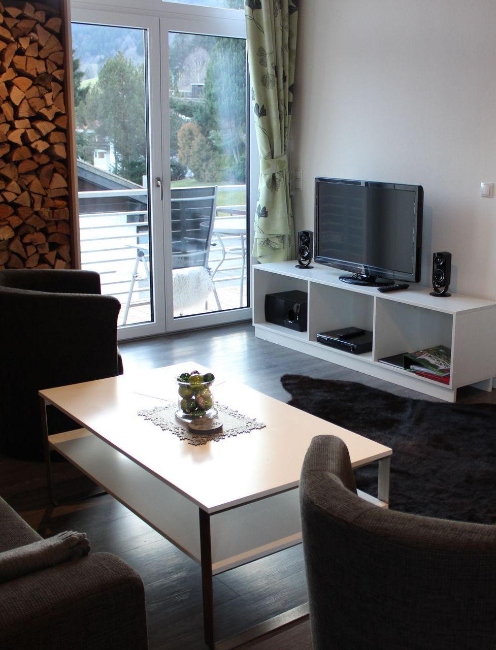 - modern-alpenländisch eingerichteter Wohnbereich mit Flachbild-TV und Stereoanlage